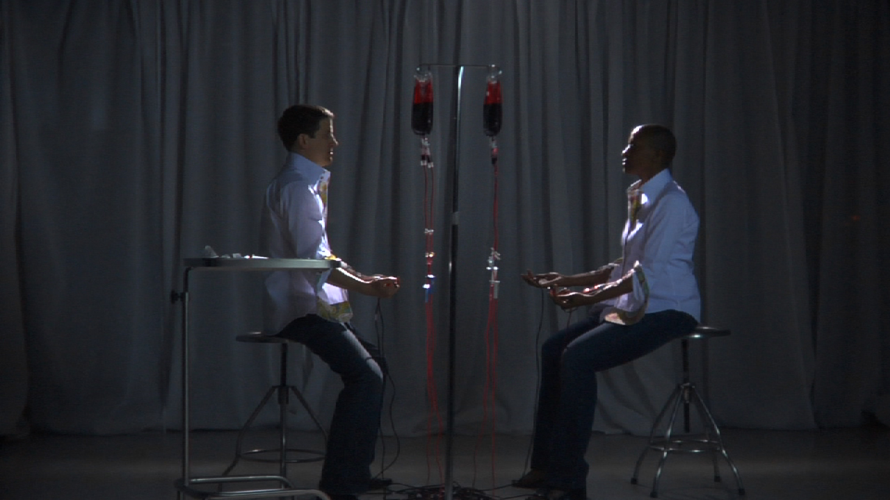 Exchange quietly refers to the “One Drop Rule” in which a person with as little as one drop of black blood in their heritage was considered “colored.” The nineteenth-century law, originally instated as a means to increase the slave population in the United States, directly lead to laws prohibiting miscegenation. Through the action of ritual blood transfer and the merging of historical sound: slave testimony, police footsteps charging “Freedom Summer” marchers and politicians denying the existence of murdered civil rights workers, McCullum and Tarry navigate ideas of blood as taint and stain, as an agent of healing, as pact and purity, Eucharist and memory.