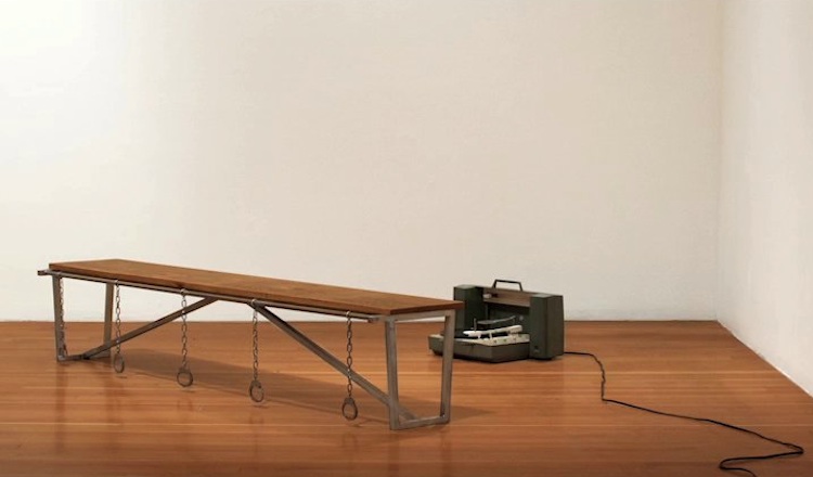 In the work Booking Bench Made From Memory, on view in the education gallery, the artist has built a 1:1 scale booking bench based entirely on her recollection of the one at the Wilshire Community Police Station in Los Angeles. Sarno recorded all the sounds of its construction including wood and metal cutting, welding and random orbit sander noise. These sounds were stretched without altering their pitch and processed to isolate harmonic frequencies. The custom-pressed vinyl record—an edition of 10—contains the resulting composition on both sides and plays on loop.