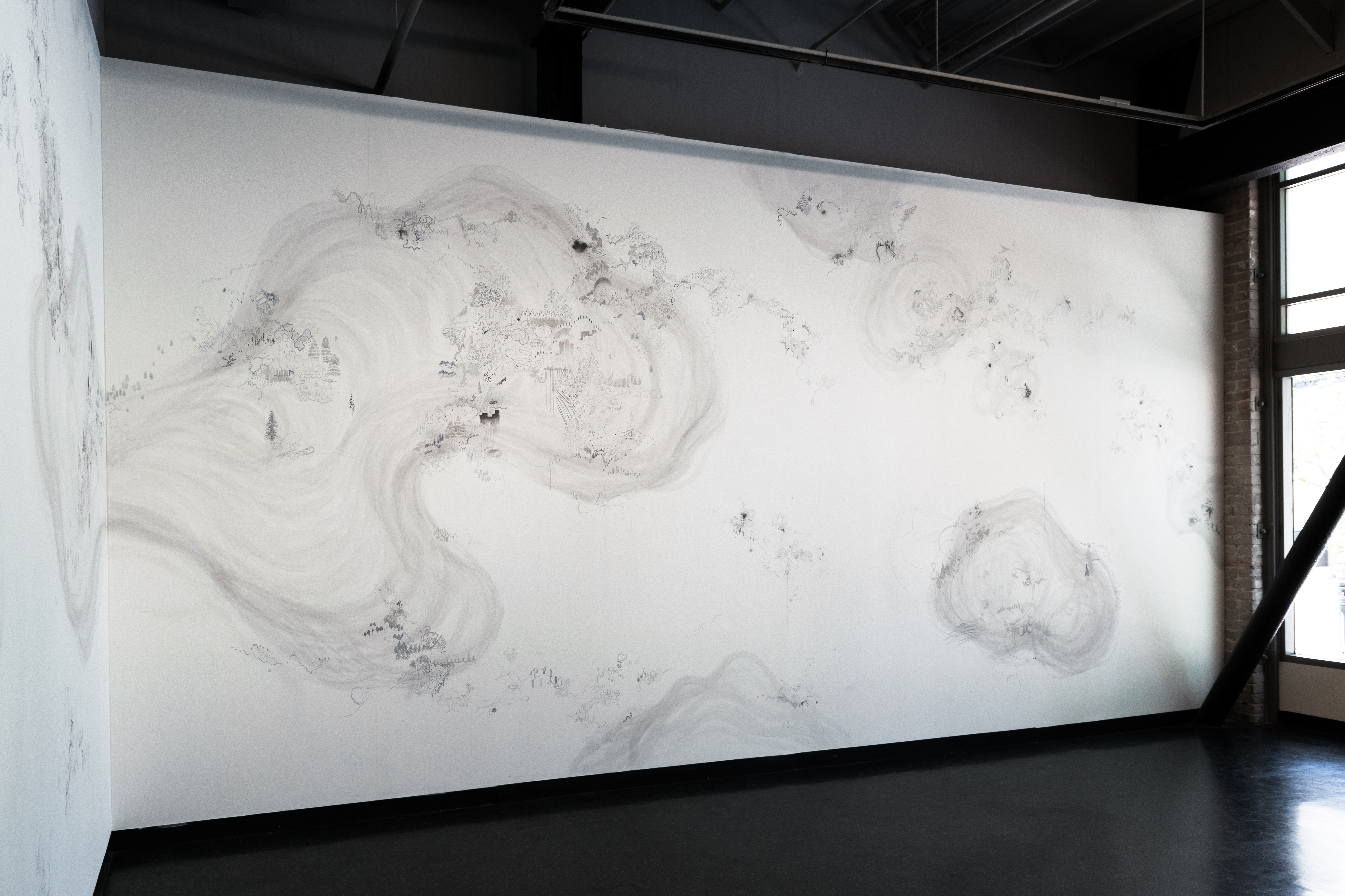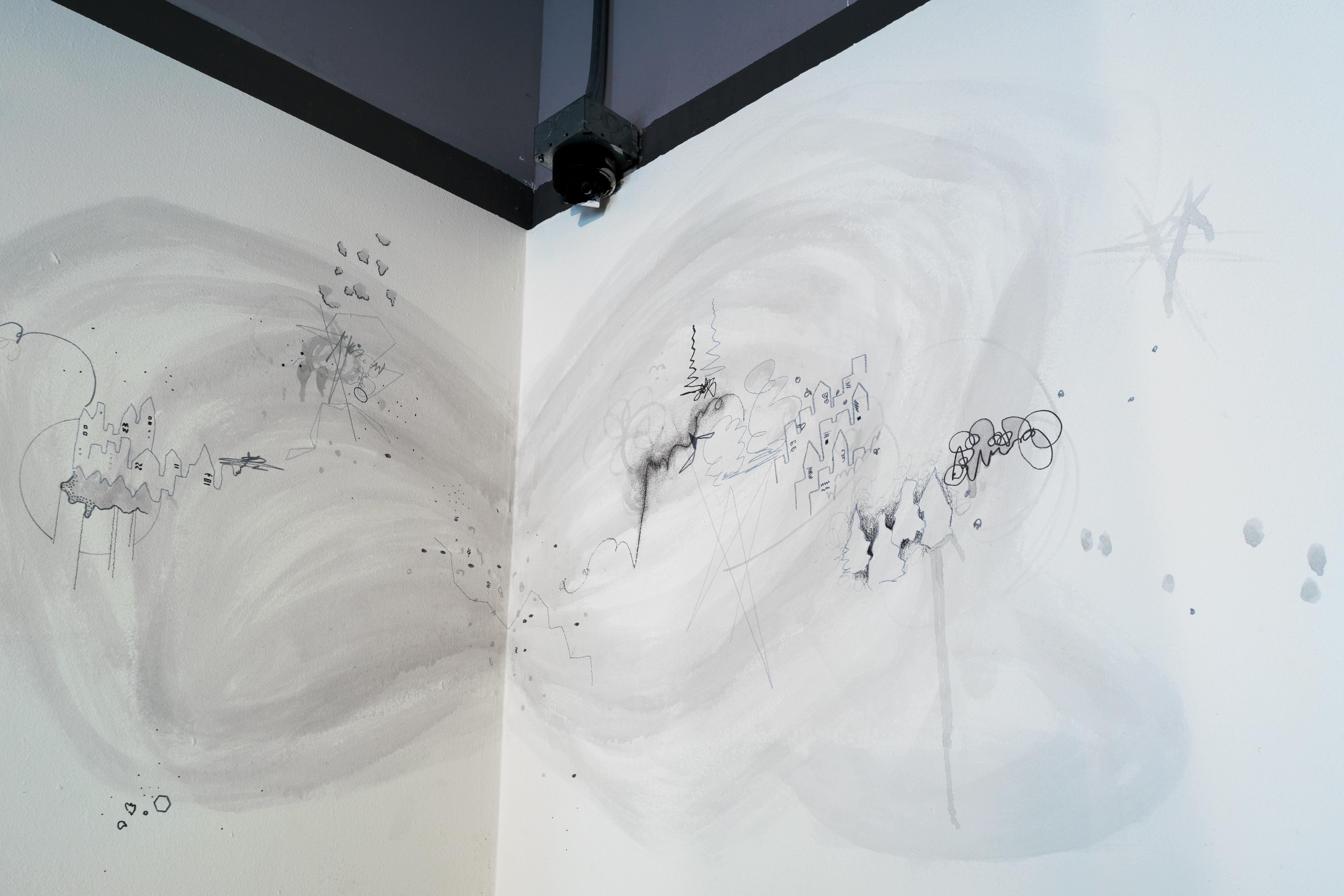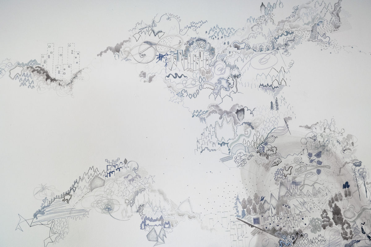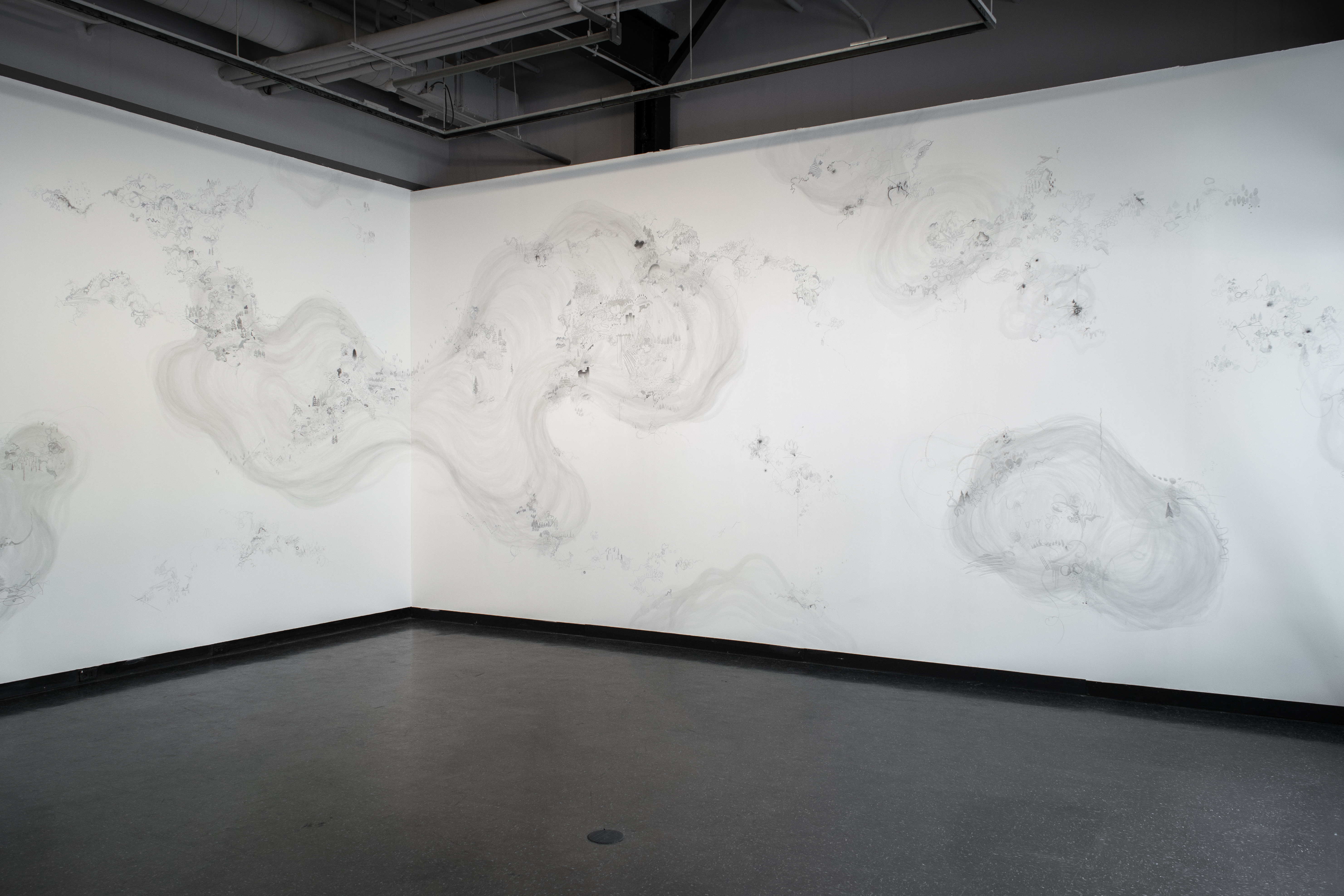 For her Grand Central Art Center exhibition, the artist takes over the project space through the use of pencil, ink/pen and India ink, applying her work directly upon the walls. The space is transformed into an installation environment, addressing the architecture of the physical space, as well as the outside world as exposed by the large storefront windows.