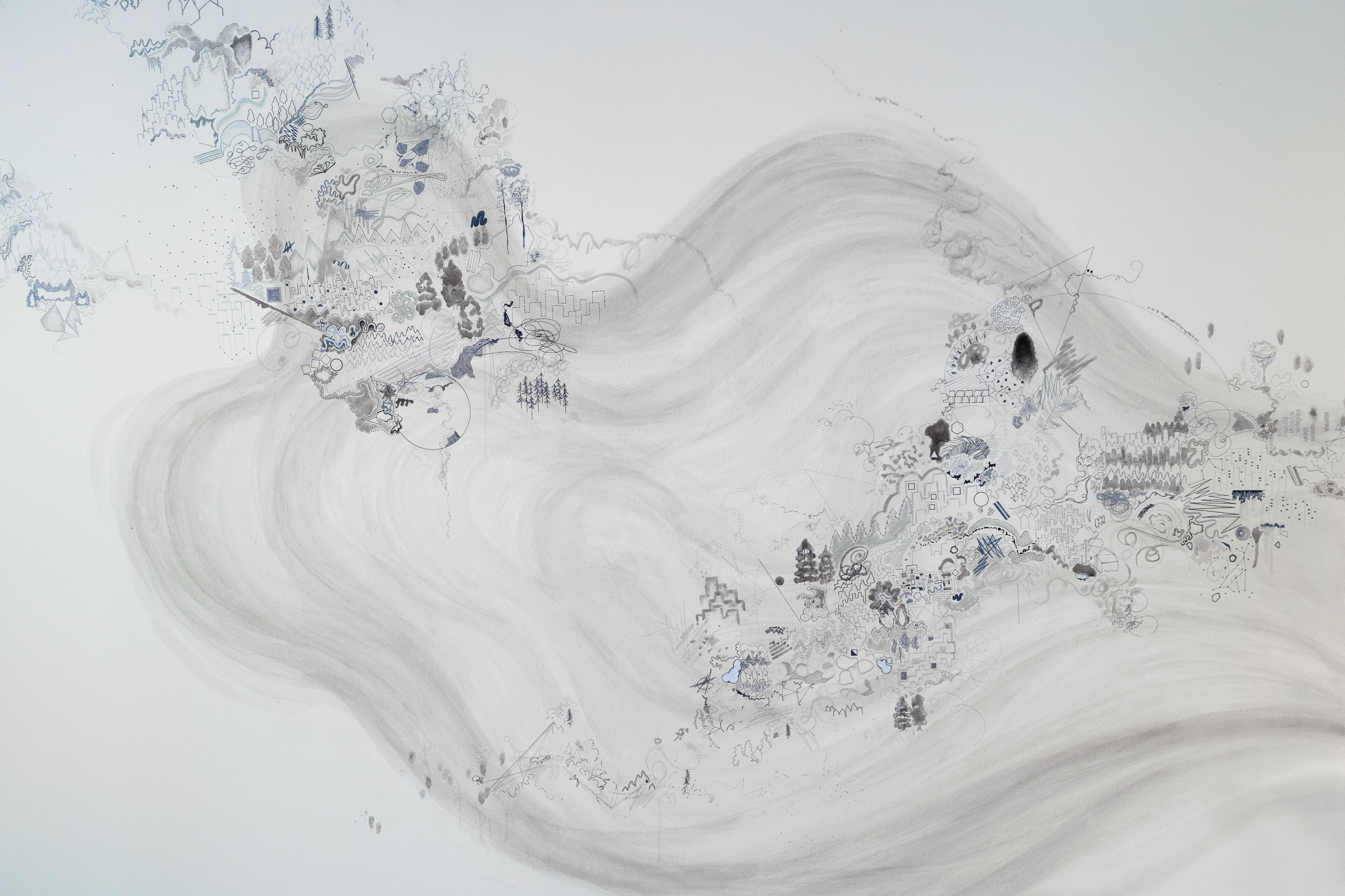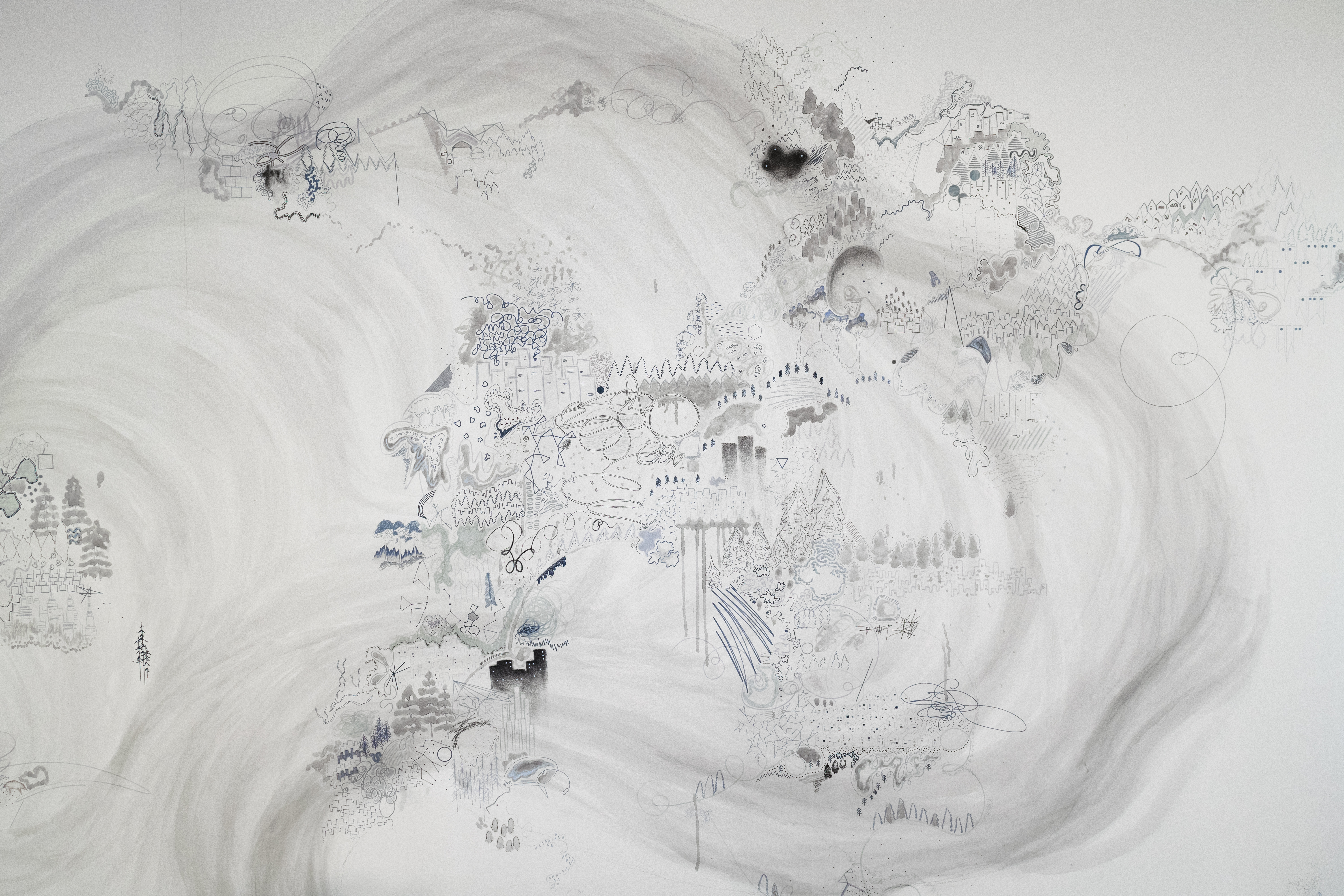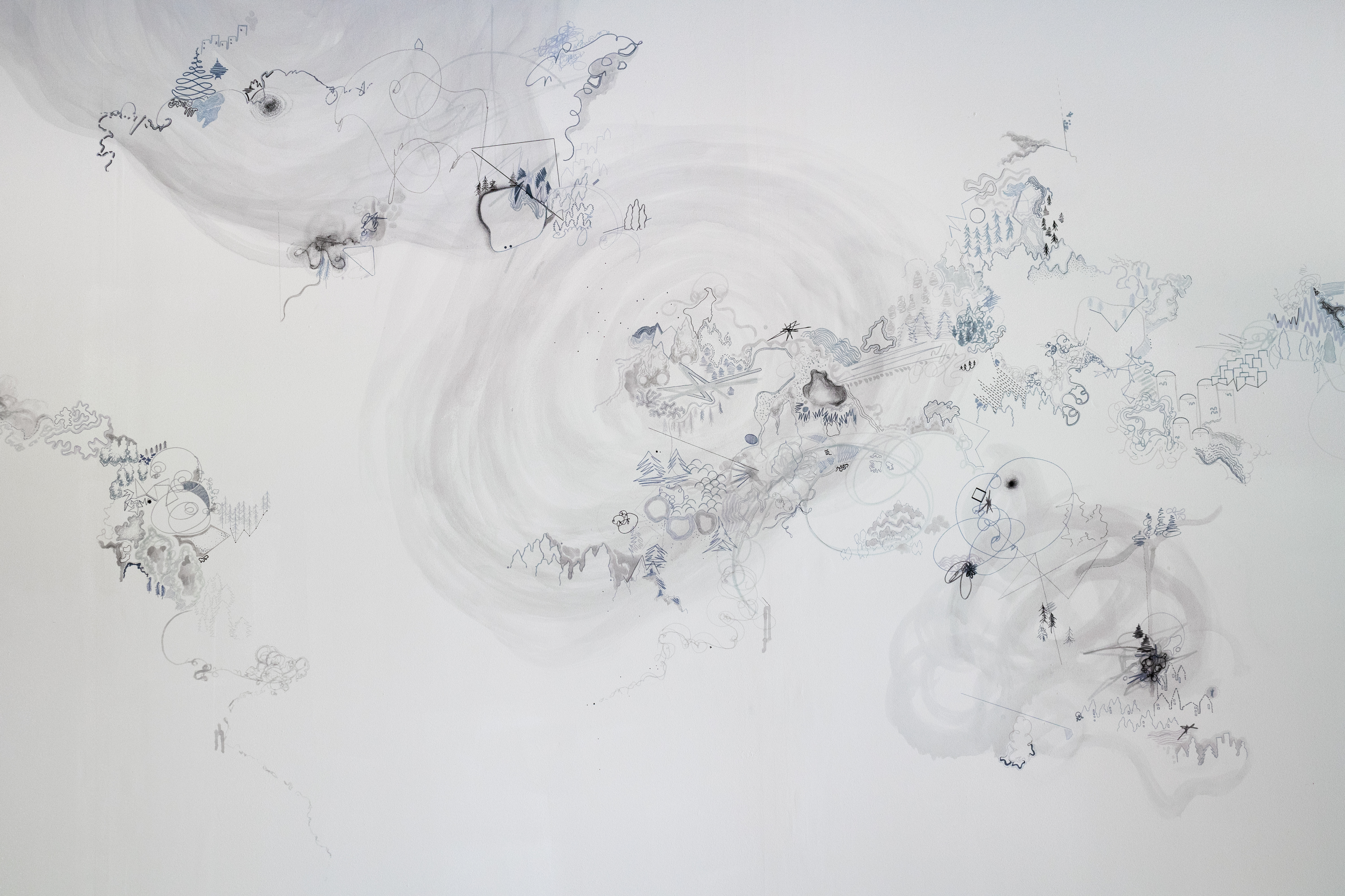 For her Grand Central Art Center exhibition, the artist takes over the project space through the use of pencil, ink/pen and India ink, applying her work directly upon the walls. The space is transformed into an installation environment, addressing the architecture of the physical space, as well as the outside world as exposed by the large storefront windows.