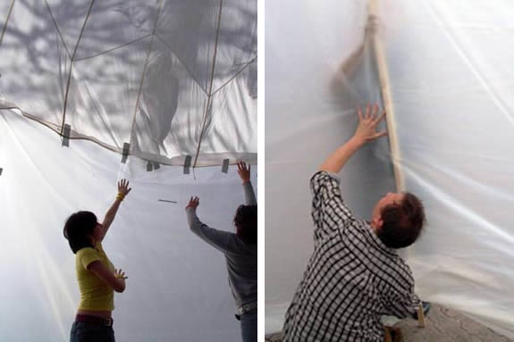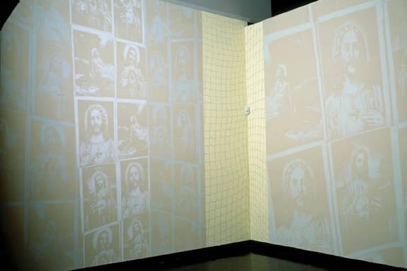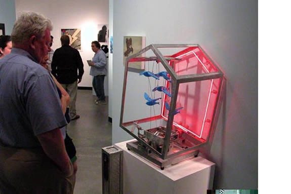 Circadian Snare is also a commentary on life. Kube probes metaphysical rather than ethical issues in this sculpture of projected light and pattern as he contemplates the soul’s willingness to be, in his words, “snared to take form.” Subjected to an array of physical laws, the incarnated soul is drawn to the attraction of life as well as the limitations of physical time and space. Live Bait, likewise, mimics the experience of being captivated. In this instance Kube uses a suspended cricket cage through which he projects light to create an environment in which the viewer has the sense of being encased like a small insect.