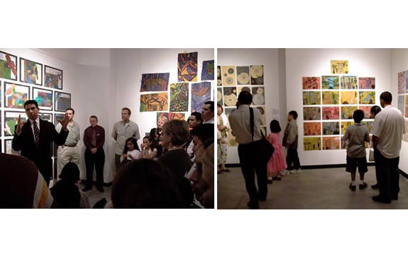 Installation shots include Edwin Maguire and Leonard Correa participating in an Artist’s lecture with the After School Arts program.