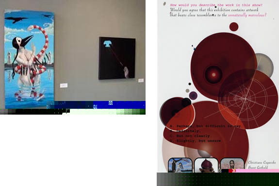 Exquisite corpse, or cadavre exquis, is a parlor game invented by the Surrealists in the early twentieth century. Participating artists drew approximations of the human form by folding a piece of paper in four horizontal sections and having one artist draw in each section, starting with the head portion; then each of the other artists drew a section without seeing the previously drawn portions of the figure. The resulting collaborative drawings routinely featured bizarre juxtapositions of imagery that often only scantly resembled the human body but always celebrated the human imagination. In exquisite electric, the artists turn their imaginations toward new technologies and give us fresh avenues to considering what it means to be human at the beginning of the twenty-first century.