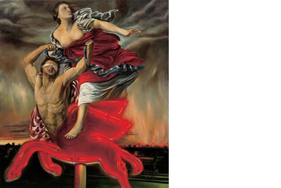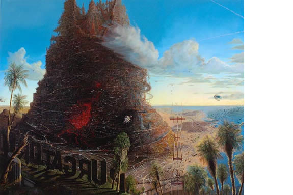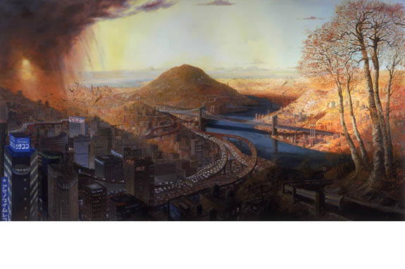 What was it about The Divine Comedy that attracted Birk to the medieval epic? Perhaps, according to Dante scholar Michael Meister, it was because “Dante asks the big questions: Where are we going? Where have we been? Why is our world such a mess?” Birk, through his series of paintings and prints, takes us on his personal tour of modern metropolises, where police helicopters hover over clogged freeways, fast food joints and used car lots choke crumbling neighborhoods, and corporate logos dot the downtown skylines. From the dark depths of Hell to the hopeful realm of Purgatory and the ethereal heights of Paradise–set against a pastiche of Los Angeles, San Francisco, and New York, as well as other cities-Birk’s Divine Comedy reminds us that the choices we make in life are likely to have eternal consequences.