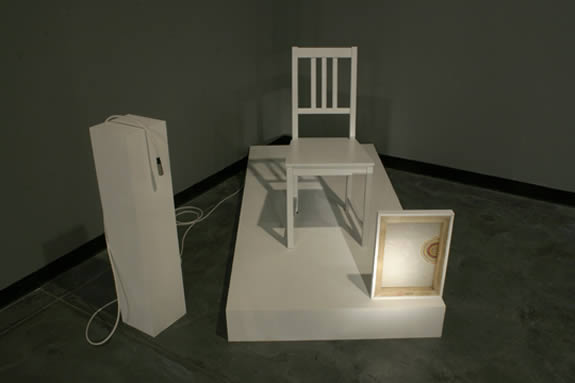 Several years ago, Hassold created two performances that, in retrospect, shed significant light on her process. In The Impossibility of Achieving Pain Without Suffering (2000), performed in a vacant gallery in Santa Ana, California, she was confined in a big white box that was brightly lit with surveillance lamps and a surveillance camera mounted in an upper corner. People outside the cube could observe her on a monitor. Hassold had also pre-arranged for a male stripper to mingle with the crowd, pushing a gurney that sported a blood bag from which he dispensed red wine to viewers.