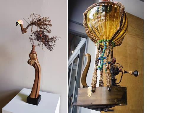 Laurie Hassold’s Strange Attractor series suggests the results from an excavation by a paleontologist in the future. Bones, combs, syringe tips, and wires are only a sampling of the components that compose her innovative and futuristic skeletal structures. Their outward appearance of muscle and tissue is mysterious, but whatever the epidermis, it is clear that they are a combination of the organic and the artificial.