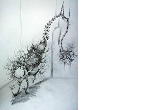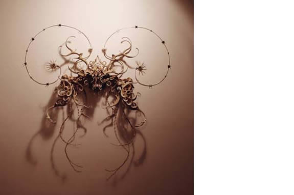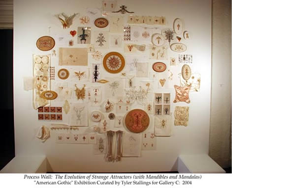 The ornamental quality of the Strange Attractor series and the components that create the Process Wall point to drawing as one of Hassold’s major sources of inspiration. Elements in the Process Wall include drawings made with insect parts (the insect carcasses were courtesy of her cat), blood drawings, pencil drawings, tests for sculptures, and what appear to be fragments of stretched lace but are in fact pieces of silk whose designs have been drawn/burned with lit cigarettes.