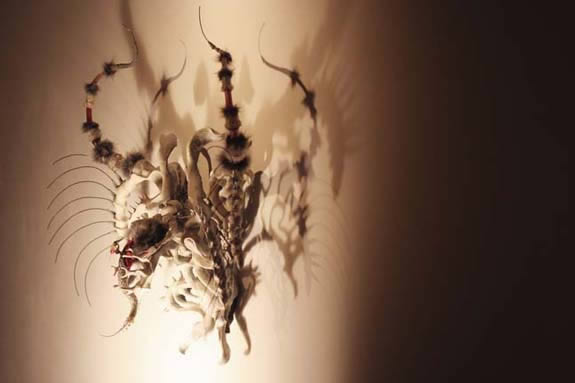 On closer inspection, it becomes apparent that they are not bones foretelling the unimaginable, like ancient Chinese oracle bones used for divination. Rather, they are intricate sculptures made from Apoxie Clay and objects found in the home. They are a cross between the handmade aesthetics of a Michaels crafts store and Dr. Frankenstein’s laboratory.