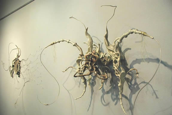 The use of industrial materials in an organic fashion alludes not only to the literary and cinematic cyborg, but also to the works of several artists such as Eva Hesse’s (1936-1970) use of latex, fiberglass, and plastics; to Lee Bontecou’s (b. 1931) drawings and sculptures that suggest the intersections of tree hollows, body orifices, armor plating, and insect bodies; and to the younger, Korean artist Lee Bul’s (b. 1964) hand-cut-polyurethane cyborgian sculptures. In another sense, Hassold’s work is a cross between Hesse and the Swiss artist, H.R. Geiger, whose psychosexual paintings of interconnected bodies and machines inspired the skeletal, aggressive extraterrestrial in the film Alien (1979).