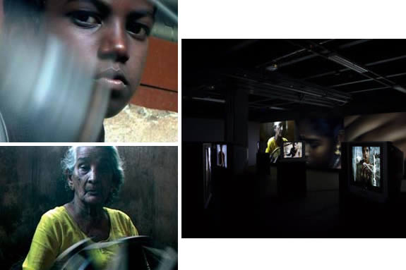 La Fabrique was created for the international exhibition lille3000. The videos, shot in Kerala, India, show male and female textile workers in their work locations and at their work stations.