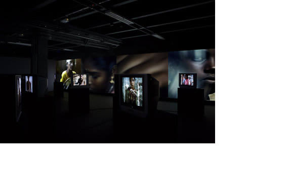 The installation chosen by Mouraud for lille3000 consists of 29 videos, 8 to 16 minutes each, shown on 25 TVs and four wall projections. [For the site at lille3000] the 25 televisions are set upon stands scattered around the space; each set with its base is to be viewed as a physical entity. What is at stake is to constantly link the viewer with the weavers, to create a complicity with them by the interplay of nonaccusatory gazes inviting you to share a common space. The wall projections [dis]place this relationship and send us back to our reality and, as Giorgio Agamben wrote, “…such as a precious veil of Maya which one will never ever be able to grasp concretely, but only through the reflected image in the magic mirror of one’s own taste.”