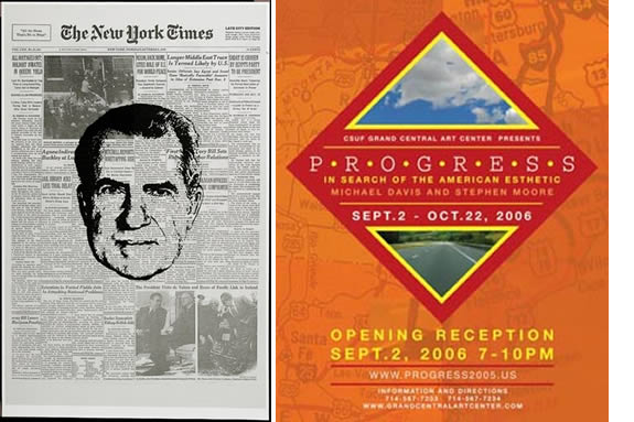 PROGRESS: In Search of the American Esthetic is an exhibition that features photographs, video projections, audio and ephemera documenting artists Michael Davis and Stephen Moore’s cross-country trip by car from California to New York in 1970 and their subsequent trip traveling the same route in reversing, form New York to California, in 2005.