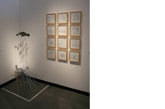 The exhibition Drawn to Gravity points to a curiosity of ideas and experimentation, triggered by the direct process of drawing. Urban environments inspire Jennifer Celio’s meticulously rendered graphite drawings on panel. Celio illustrates not only the passing of time but also a process of change. Zachary Kleyn’s new drawings and sculptures question specific ways in which we navigate through life. The drawings, transparent and opaque, geometric and organic, do not follow normal rules of nature but instead act as metaphors to link disparate images and ideas. Kleyn will also exhibit a selection of new sculptures tangibly depicting seemingly impossible circumstances. The inspiration for the intricate and multi-layered drawings of Naoe Suzuki comes from medical dictionaries, journals, textbooks and catalogs. In her current work, Suzuki references art history, religious iconography, fashion and plant forms. These diverse and vague influences are pushed together to form quirky, yet delicate and poetic compositions.