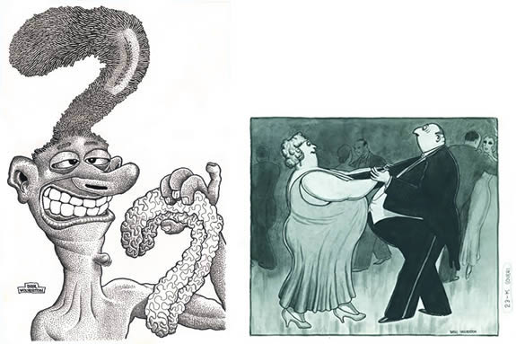 Basil Wolverton, a unique cartoonist in the decades from the 1940s to the 1960s, was best known for his depiction of human and otherworldly creatures rendered with smoothly sculpted features, spaghetti-like hair, and extremely detailed crosshatching. Born in Oregon in 1909, Wolverton pitched his first comic strip to a syndicate at the age of 16, but it wasn’t until 13 years later that he would sell his first comic features to the new medium of comic books. “Disk-Eyes the Detective” and “Spacehawks” were published in 1938 in Circus Comics. In 1940, “Spacehawk” (a different and improved feature) made its debut in Target Comics. The series ran for 30 episodes (262 pages), until 1942. “Powerhouse Pepper,” Wolverton’s most successful humor comic book feature was published in Timely, Marvel and Humorama comics from 1942 through 1952.Wolverton penned many other features, producing a total of some 1,300 comic book pages. In 1946 he earned first prize for his rendition of Lower Slobbovia’s ulgliest woman, Lena the Hyena. The contest, part of Al Capp’s “Li’l Abner” newspaper strip, was judged by no less than Boris Karloff, Frank Sinatra, and Salvador Dali. It won Wolverton fame and notoriety, and moved his career into the mainstream spotlight for a few years, with features and caricatures appearing in Life and Pageant magazines. At the peak of his style, in the early 1950s, he produced what many regard as his best work, 17 episodes of comic book horror and science fiction. During the ’50s, his work was prominently featured several times in the early MAD magazine, as well as Life and Pageant. In his later years Wolverton produced a story of the Old Testament, which included more than 500 illustrations, and created a series of apocalyptic illustrations based on the New Testament’s “Book of Revelation.” During this time he continued to create outrageous cartoons for clients as diverse as Plop, Playboy and the Topps Company. Wolverton died in 1978.