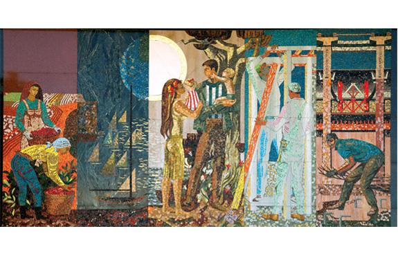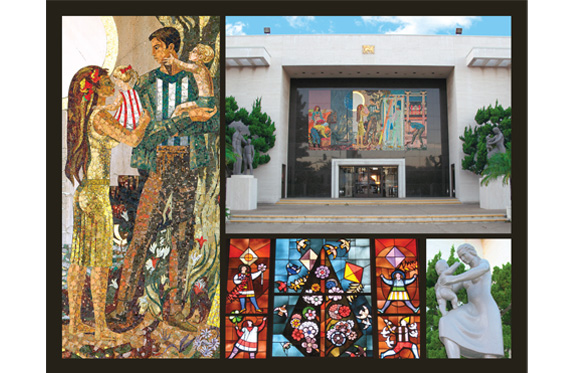 Millard Sheets: The Art of Home Savings & Loan creates a renewed awareness of the Home Savings & Loan mosaic murals located throughout Southern California, originally designed by the Millard Sheets Studio. Included in the exhibition are images of the mosaics, original works of art, sketches, supporting documentation and images of the restoration process of the Rolling Hills Estates mural. The exhibition focuses on five of the mosaic murals located in the communities of Temple City, Rolling Hills Estates, Anaheim, Pomona and Santa Ana.