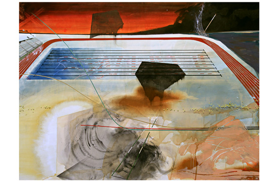 Both abstract painting and border-making rely on the assumption that absolute space (the “free” space of the canvas or landscape, unresolved and contested), can be materialized through its transformation into a space of containment and law (the “painting”, the “nation”). The relationship of a contemporary artist to his or her space (in this case de los Reyes to Los Angeles), is also the story of a space and its connection to the past (Los Angeles to Mexico) and occupation (artist to painting). In the Border Theory paintings, de los Reyes pursues the amorphous, layered structures of identity as found in the continuum of his location and profession.