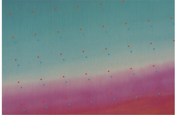 The “depictions” found in the Border Theory paintings come directly from sections of the US-Mexican border captured by satellite photography. From such altitudes, regional landscapes are flattened into nebulous areas of shifting form, color and tone. These types of surfaces, analogous to those found in post-war abstract painting, are re-contextualized through de los Reyes’ saturation of unprimed linen with multiple layers of fabric dyes. Above these fields of color, de los Reyes superimposes demarcations in oil, either through the use of singular, thin lines or gridded expanses of marks which explicitly refer to locations along the US-Mexico border. The resulting works imply how our cognition of space, and the process of its utilization, forms the basis for both personal and political consciousness.