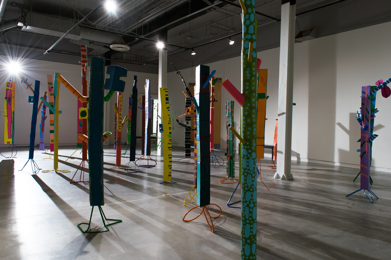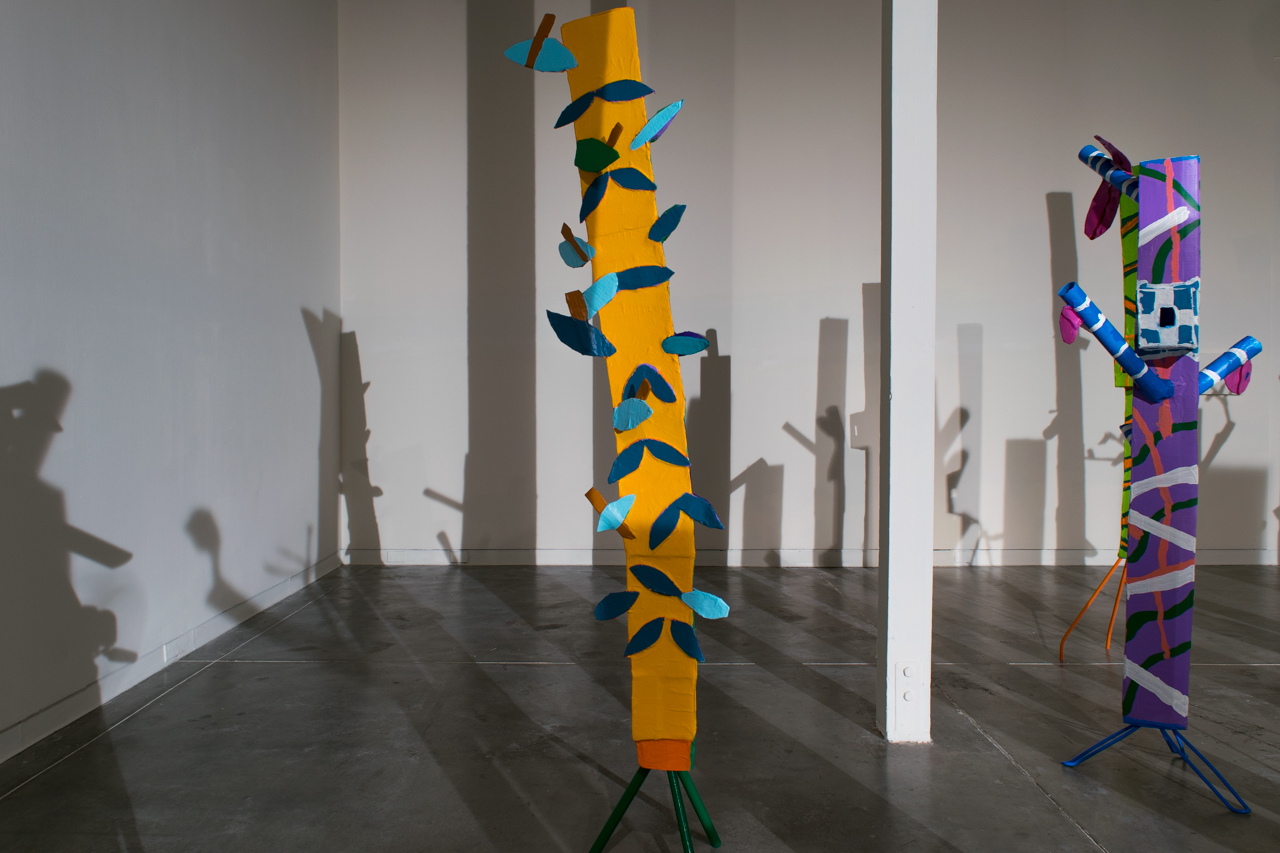 Pulling the Forest Along the Road is a collaborative work of HOPE Center for the Arts artist Darren Petersen and mentor artist Diana Markessinis. Developed through a year-long collaboration, this exhibition is the embodiment of an ever-evolving dialogue through cardboard and paint between two artists exploring what it is to be human, to create, and to understand one another. Their work together culminates in the creation of thirty-two individual sculptures and sound installation, a forest of unique and quirky individuals.